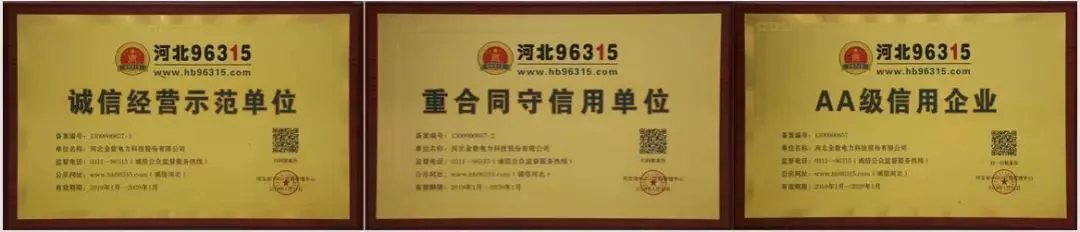 金能电力荣获河北96315“诚信经营示范单位”、“重合同守信用单位”、“AA级信用企业”